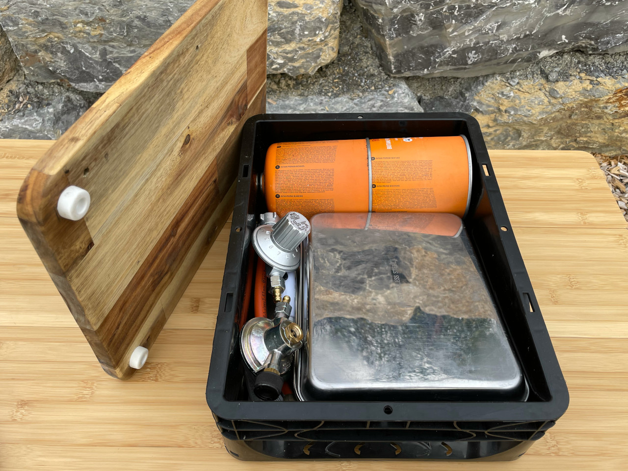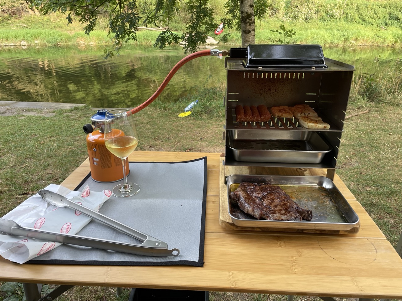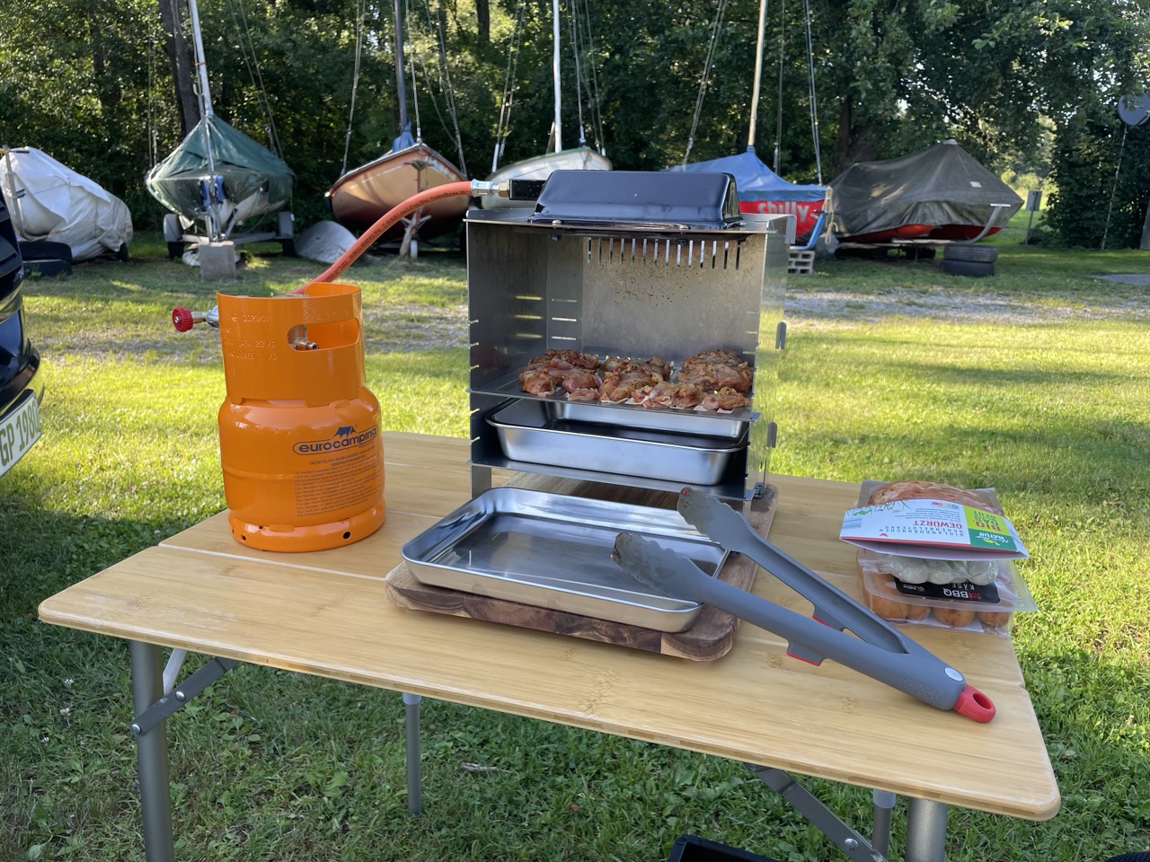 Der Grill kann wahlweise mit EN417 Gaskartuschen oder auch mit einer normalen Gasflasche betrieben werden und strahlt von oben auf das Grillgut. Dadurch kann das Fett austreten und nach unten abtropfen, ohne zu verbrennen.