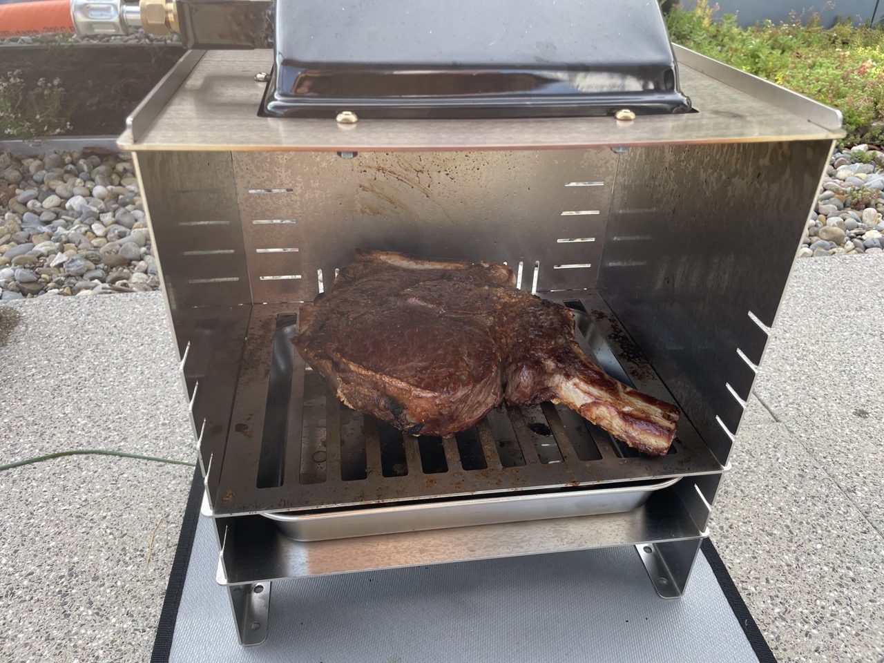 Durch die Hitze von oben kann das Fett nach unten abtropfen, ohne zu verbrennen.