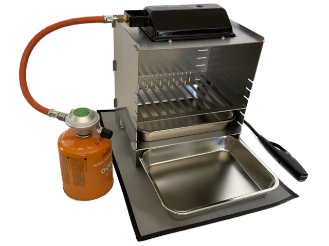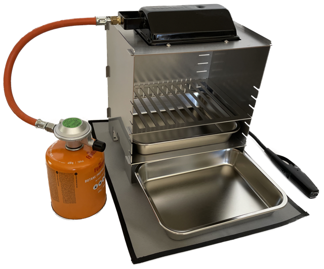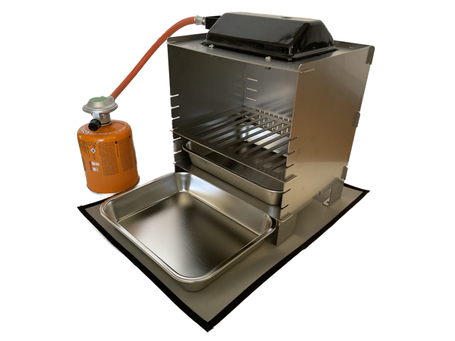 Hergestellt aus hochwertigem Edelstahl, ist er leicht zu reinigen (auch in der Spülmaschine). Der Infrarot-Brenner funktioniert sehr effizient mit Gas, erreicht eine Temperatur von bis zu 800°C und benötigt fast keine Aufheizzeit.