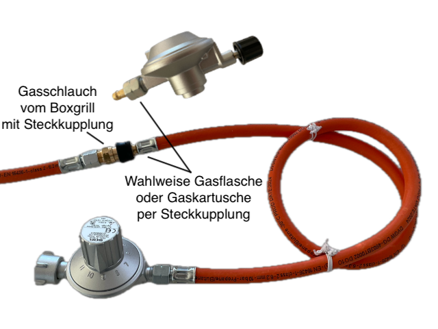 Das Gasflaschen-Anschlussset ermöglicht den einfachen Anschluss des Boxgrills an herkömmliche Gasflaschen. Durch die praktische Steckkupplung (NW5) lässt sich der Grill mühelos von der Gasflasche trennen und bei Bedarf weiter auf den Betrieb mit einer Gaskartusche umstellen.